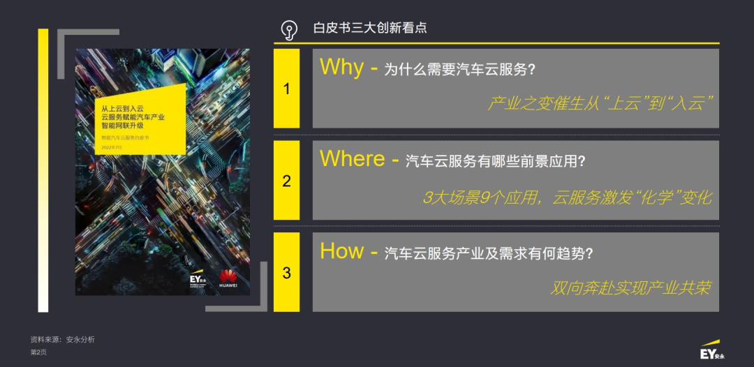 为此,安永(中国)企业咨询有限公司和华为智能汽车解决方案BU联合出品业内首个智能汽车云服务白皮书 ——《从上云到入云,云服务赋能汽车产业智能网联升级》。这本白皮书基于安永汽车团队多年行业洞察经验、华为在ICT领域的积累,以广泛而详实的调研为支撑,科学而系统性地回答了“Why——汽车云服务为什么重要?”、“Where——汽车云服务有哪些前景应用?”和“How——汽车云服务产业会怎么变化?我们需要怎样的汽车云服务?”三个问题,带领读者深入浅出地了解智能汽车云服务。