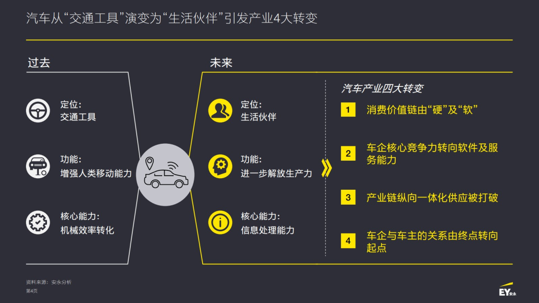 汽车“新四化”步入下半场,汽车产业变革的重心正向智能化与网联化迁移,带来的一个核心转变是对汽车定位的变化——从传统的“交通工具”转为新时代的“生活伙伴”。这一转变对消费价值链、车企的核心竞争力、产业链供应体系以及车企与车主关系变化都带来了深远的影响: