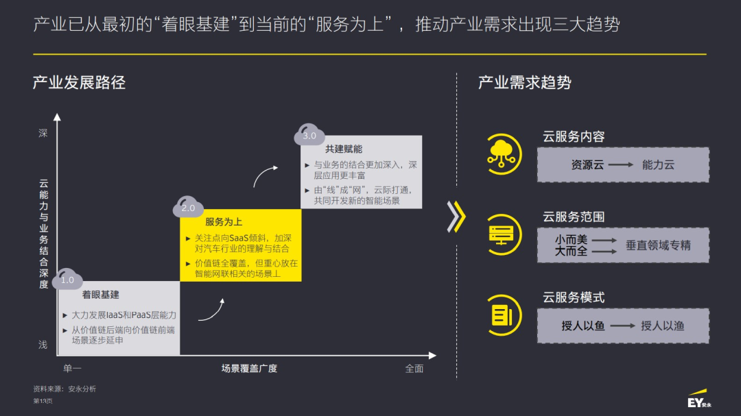 2、在服务范围上,从“小而美”的单一业务服务,或“大而全”的泛生态化服务,转向需要汽车云服务商在垂直领域做专做精,围绕核心场景提供极致体验的汽车云服务,解决“数据孤岛”与“业务断层”。