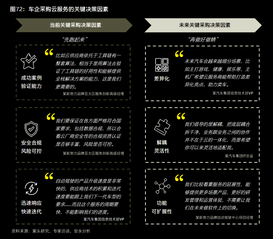 要保障先跑起来,首先,汽车云服务商需要懂行业know-how,且具备成功经验;同时,要严格保障安全合规,符合国家要求;第三,汽车云服务商需要以强大的技术作为支撑,能快速响应市场需求和开展技术迭代。