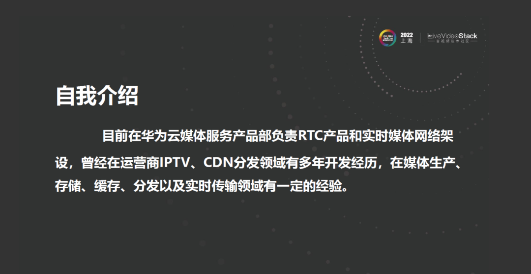 首先做个自我介绍,我来自于华为云媒体服务商品部,目前负责RTC产品和实时媒体网络架设,曾经在IPTV、CDN分发领域有多年开发经历,在媒体生产、存储、缓存、分类以及实时传输领域有一定的经验。