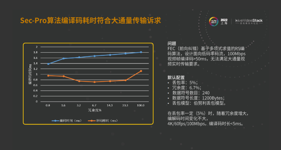 我们选用的方式叫Sec-Pro,它实际上是一个基于快速复列变换的RS的编码方式。这个编码方式的数学原理叫FFTRS,在基于伯努利丢包模型测试的情况下,首先做的测试是编译码的时长,在大码率的视频场景下,编译码的时长能不能小于5ms(实际测试时,编译码的时长基本上是小于2ms)。而且随着冗余率的升高,编译码的时长并没有升高,这个大家可以实测的。