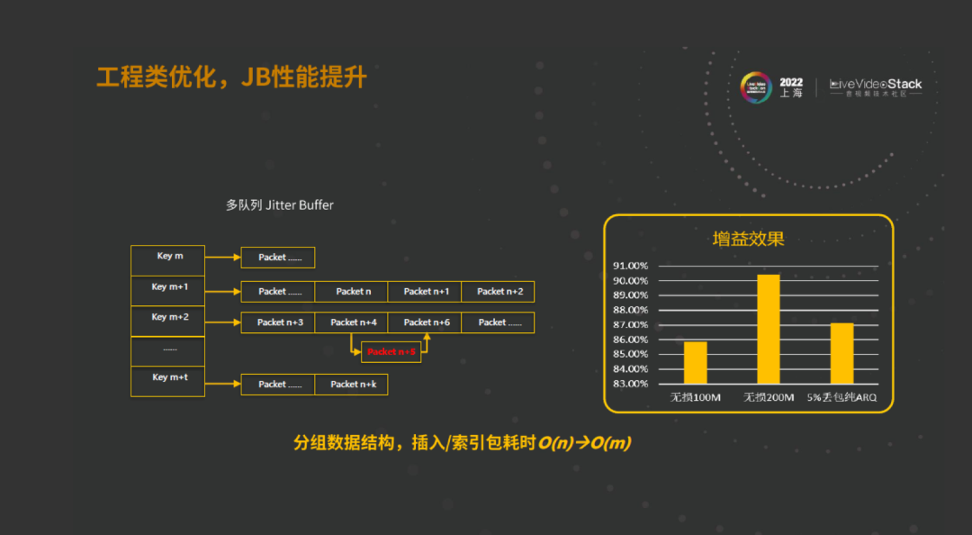 面向包端链表,我们做了一个分队列的操作。这样在大通量的场景下,链表非常长的场景下,查询效率会有比较大的提升。同时,我们也把Jitter Buffer里FEC相关的部分独立成另外一个线层,这样就不会阻塞Jitter Buffer的处理。最终增益的效果可以看对应测试的结果:在无损100M、无损200M和5%丢包纯ARQ的场景下,相对于原来的时延,都会有85%以上的增益,也就是1ms。
