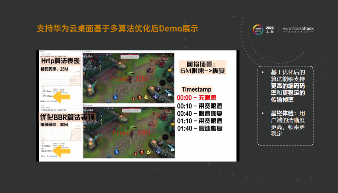 上面的图片是基于TCC改的算法,可以看到,一开始不限速,限速后恢复,再限速,再恢复,可以看到网络的跟随性。现在选用的是BBR的算法,并且做了一些对应的修改。它的算法支持更高的编码码率和稳定的传输帧率,最终用户的清晰度会更高,帧率也会更稳定。