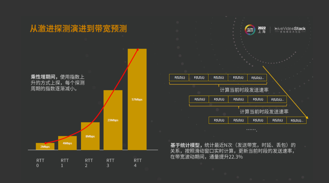 所以面向大通量的应用场景,在乘性增期间用指数上升型的方式做上探的。指数也并不是按平方的方式,逐渐减少的。RTT其实并不太合适,因为UTP的探测是基于端侧的定期的feedback来给到,但是一般情况下大家都喜欢用RTT,所以我就用RTT方式来描述。我们希望用5个RTT的时间,用5个feedback的时间能够探测到比较高的可用带宽。但这种方式还是有问题,因为这种探测的方式,无论有多少个RTT,它永远是滞后的。也就是说,当前的数据,实际上计算的是过去时间的网络情况,还是不准确,而且这种方式的网络抖动很大。那么我们又想能不能用预测的方式。