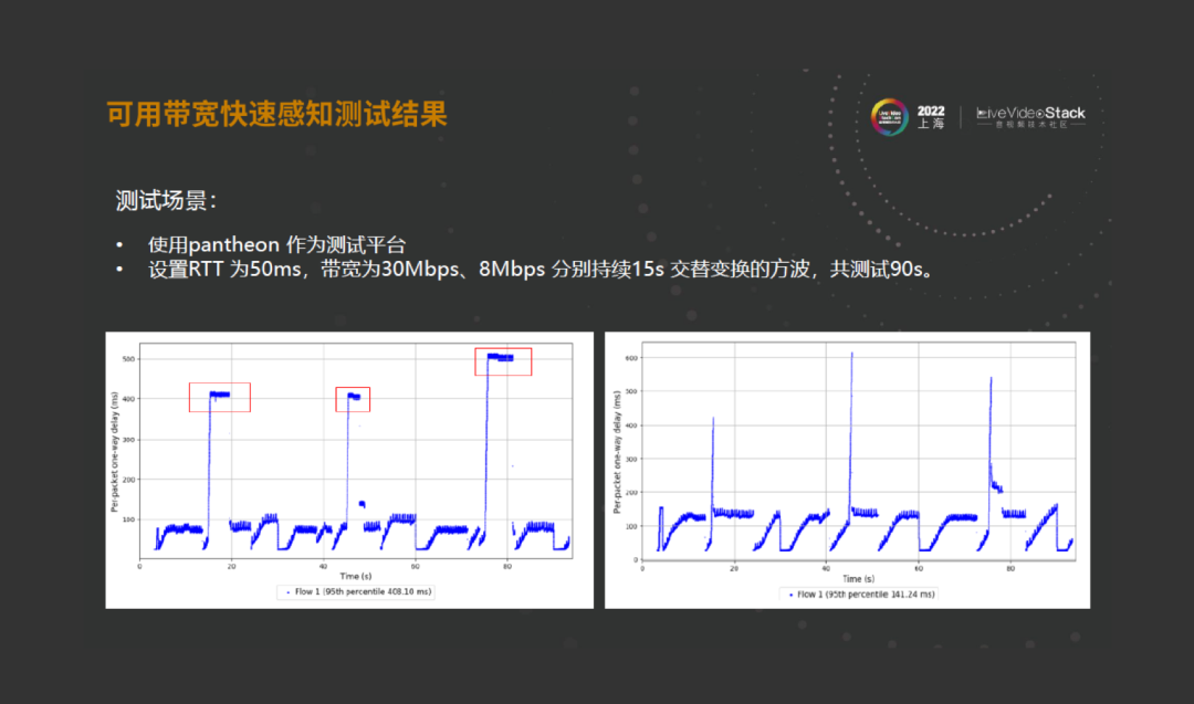 我们也可以看到,用快速带宽感知的测试结果。使用pantheon作设置平台,设置RTT为50ms,带宽为30Mbps、8Mbps分别做15s交替变幻的方波,大概测90s。在做探测时,注意,这个探测没包含前面的指数探测,可以明显看到,原来探测时,在一段时间内它是拥塞的,delay非常长,基本是一个方波的时长。但是用预测的方式,实际上就是在网络带宽变更的时间点会产生非常短时间的delay,在剩余时间很快就恢复到正常的带宽了。