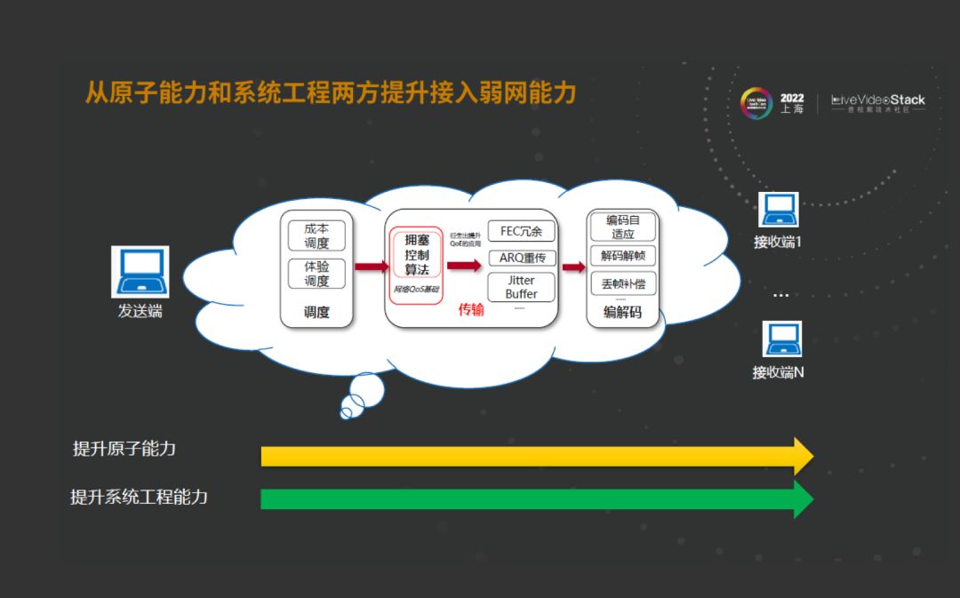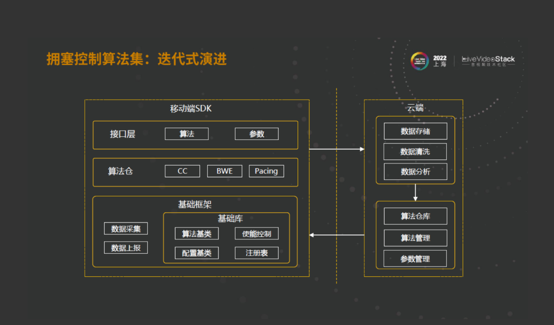在这里所讲的所有的逻辑都尽量避免SDK的变更。我们希望把控制部分放在云端。因为做TO B服务,不能限制SDK,不可能跟着版本升级,所以我们希望在云端进行操作。同时,通过这样的循环方式,我们在能够提取到业务与网络的情况下,可以得到应该是用什么样的算法参数,形成一个正循环。上面从基础设施,接弱网和外网传输介绍了我们做低时延大通量的成果。