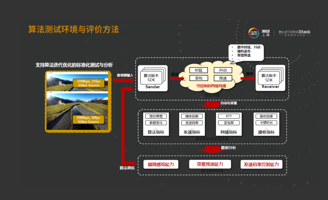 首先在实验室我们做了一个可控的网络环境,可以额外增加时延抖动和丢包,以及做带宽限制的处理,包括其他的网络处理。同时在发送端和接收端有多个版本的SDK,每个版本都会自动化采集一些算法指标,发送指标,网络指标以及接收指标。每个指标都有对应的数据。最后根据数据的分析结果,抽象提炼弱网感知能力、带宽预测能力和发送码率控制能力。