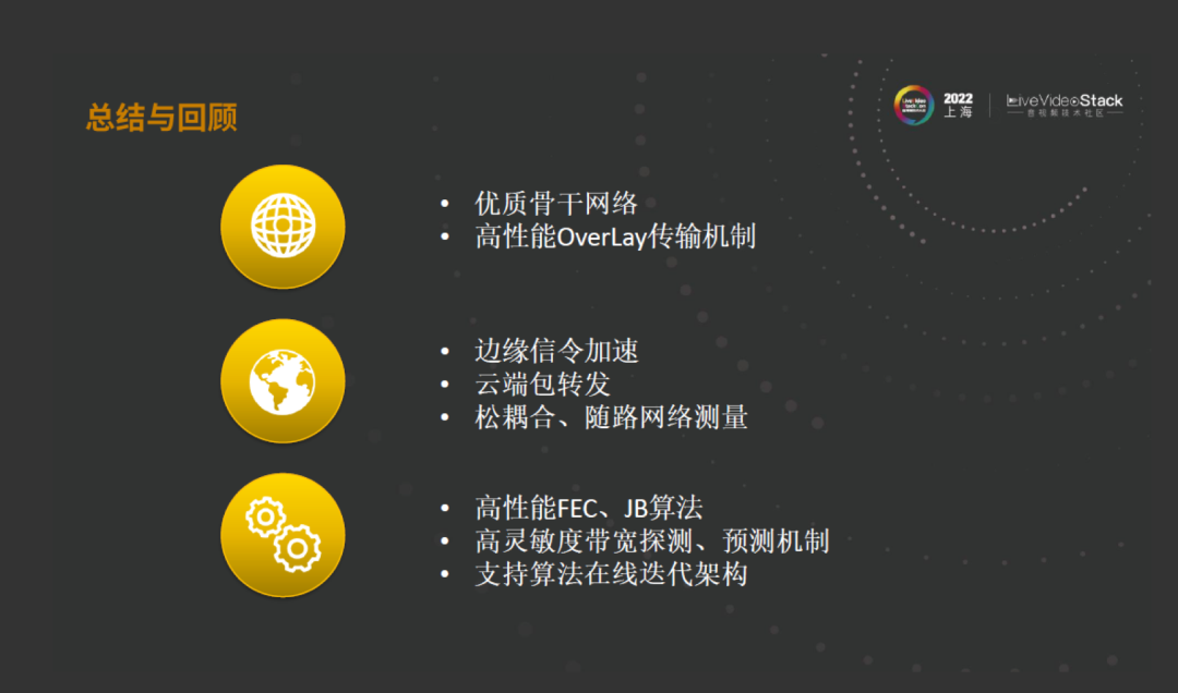 最后做一下总结,如果想做好大通量低时延的网络,我们希望有优质骨干网络、高性能OverLay传输机制,云端具有信令加速的能力、不引入额外时延的能力以及松耦合和随路网络测量的机制。对于接弱网这一点,我们希望有高性能的FEC和Jitter Buffer算法,高灵敏度带宽探测和预测机制,以及支持算法在线迭代的架构。