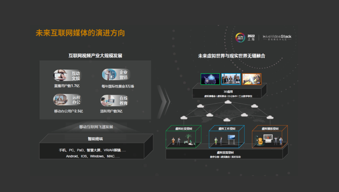 首先看第一部分,未来互联网媒体的演进方向。从现在来看,我们互联网媒体经过多年的发展,在互动文娱,企业营销,包括远程办公和在线教育等等一些领域已经得到长足的进步。但是随着2021-2022年元宇宙的技术和理念的兴起,很多公司都在面向未来虚拟世界与现实世界无缝融合的方向发展。我们也可以看到一些让人比较惊艳的应用,我个人比较喜欢华为基于一个虚拟空间的千万人在线的巡回演唱会,让我非常惊艳。