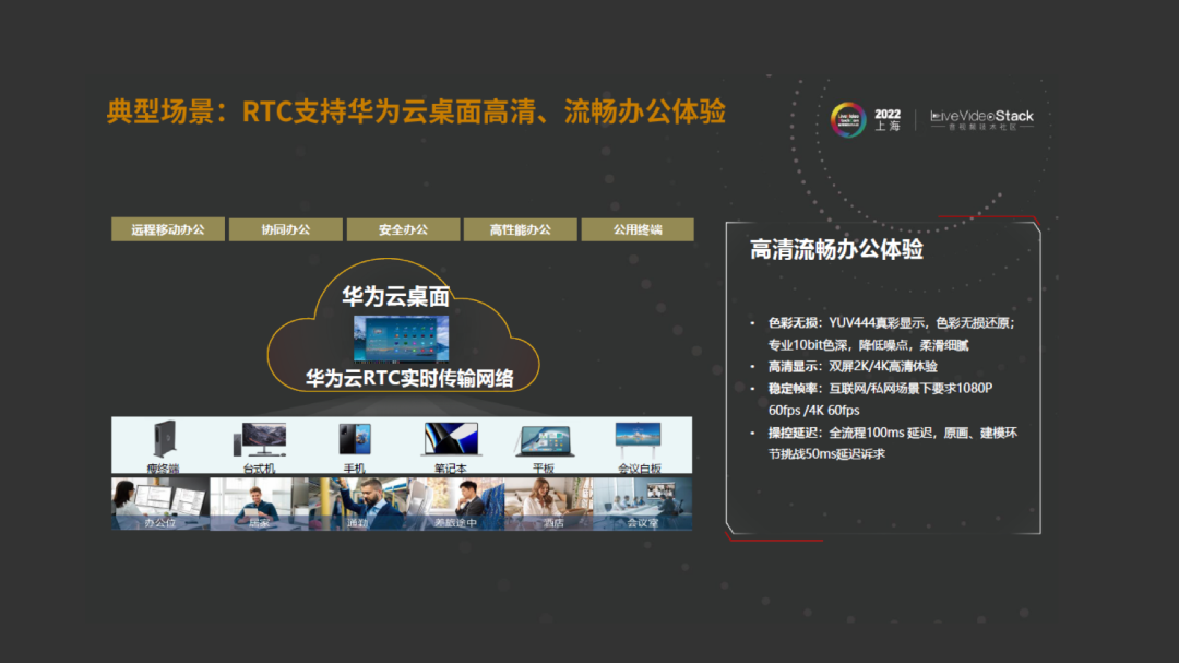 举一个典型的案例,华为云的云桌面的高清流畅办公体验。简单来说,云桌面是把线下的主机搬到云上使用,随时随地可以用的显示设备以及件数设备,能跟云上的服务器产生联系,这样就能解决传统的数据拷贝的问题、数据安全的问题、多人协同办公的问题等等。但这样就面临一个非常现实的问题,即桌面中有一个场景叫设计师桌面。设计师桌面的要求与普通办公的桌面要求是完全不一样的,因为他们的眼睛、耳朵跟我们的不一样,所以会有这几个要求:第一个要求,设计师要求色彩无损,即不要YUV420,要YUV444,同时要求色彩还原,专业10bit色深,降低噪点,柔滑细腻。同时设计师的办公环境一般来说是双屏三屏,2K/4K的屏。同时,一些原画设计、游戏设计会要求具有比较稳定的帧率,比如需要1080P 60fps/4K 60fps的要求。最后还有操控体验的要求,鼠标、键盘的设键上行一直到云端渲染、采集编码的下行,端到端要求100ms,至于原画和建模的环节,希望是50ms,这对于底层华为云RTC实时网络带来一个大通量的dis键的技术诉求。
