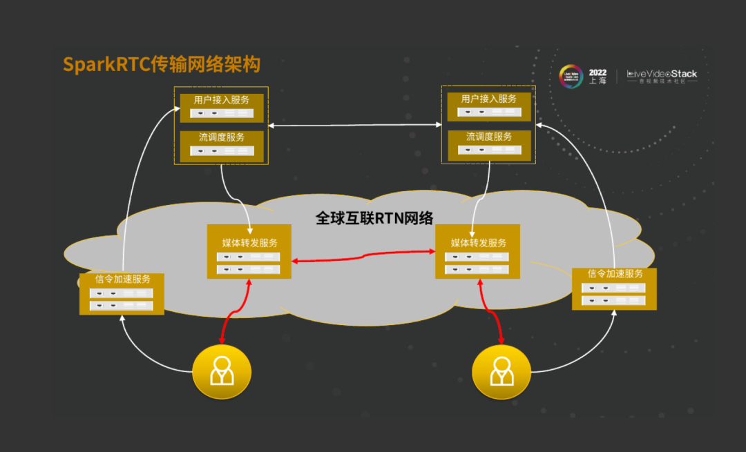 同时媒体转发服务之间是通过全球互联的RTN网络来做点对点的互联。