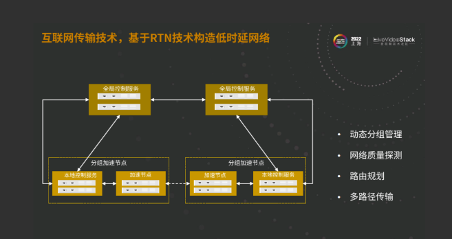 我们会做一个基于全球分布的加速节点。这里的加速节点,特别说明一下,是动态分组管理的,即根据长期网络探测结果进行一个分组。然后全球的控制服务会告知加速节点到底应该向哪些加速节点去做对应的探测,然后根据探测结果去做跨组以及组内的路径规划。同时基于路径规划我们也提供了多路径传输的能力,这样就在OverLay层上保证低时延和高可靠的路径传输。