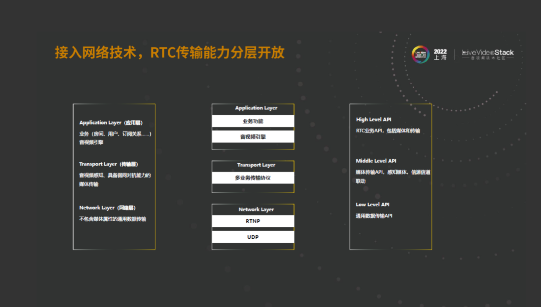 但是这样做了之后还是不行,有的客户不想要传输和音视频的能力,只想要接入和选路。我们又把最底层网络层以及在上面分装的RTN层开放出去了。这一层就是通用数据的传输,只是保证就近接入以及在云端的最优选路。