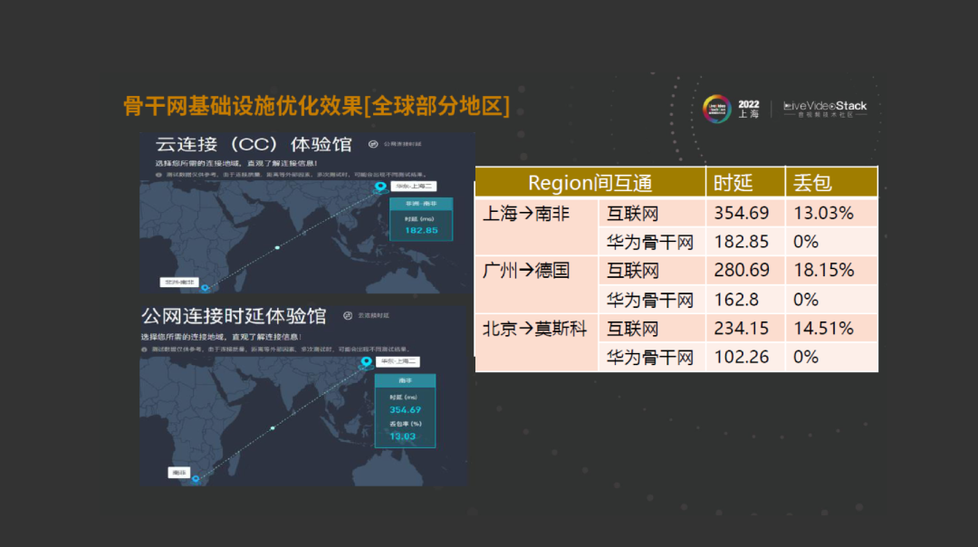 这里有两张图,第一张图是基于华为骨干网的,产品叫云连接,CC互连。它是通过专线的方式去做两地之间的通讯。可以看到这个例子,上海到南非要182ms,但如果要走互联网的话,因为互联网的路由设备和路径是不可控的,需要354ms,同时会有一定的概率丢包。