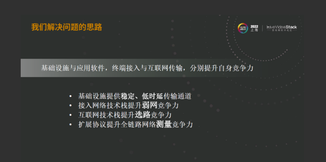 首先,基础设施要能够提供稳定、低时延的传输通道;基于网络技术栈能够提升和支持弱网的竞争力;互联网外网络能够提升选路竞争力,主要是做可靠、可低时延。最后,我们希望基于UTP的扩展协议,通过端到端全链路的方式提升网络测量的能力,针对测量数据去做端到端的正循环。