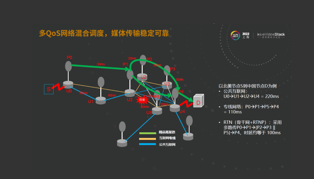 以北美到中国的一个节点为例,如果全走公共互联网,需要220ms。如果走专线,可能要110ms。为什么要RTN呢?是因为不管走互联网也好还是走专线也好,只要路径是通的,路径永远都是固定的。在路径优筛的时候,我们希望能够快速地以秒结的方式切换到另一条线路,所以引进了RTN的概念。以中间可以有可选路径的方式,这样的话就可以做到低时延、高可靠的技术目的。