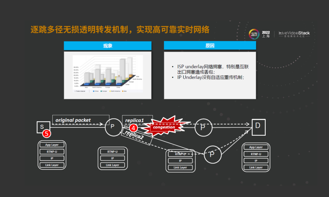 对于实时业务来说,如果出现这种场景,实时业务就没法实施了。所以也需要有一个基于underlay的基础设施的OverLay的支持性存根技术。加速节点可以主动发现在传输节点和传输节点间的丢包,这样的话先于业务发现丢包,主动缓存重传的机制可以保证传输的可靠性,就可以做到往无损的方向演进。