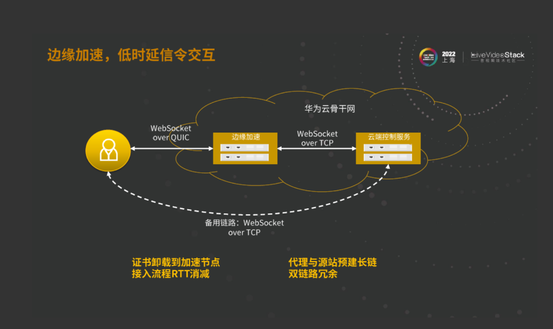 第二,可以看到前面架构图里有一个叫信令加速的服务。这个服务把证书下载到边缘节点。这样如果还是TCP接受方式,所有证书的交互就是就近交互,路径就缩短了。