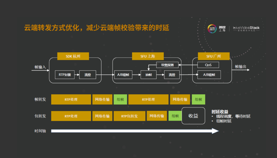 组帧有两种方式,一种是时延触发的,一种是定时判断的。如果按定时判断来做的话,组一帧至少要消耗一个探测周期或者两个探测周期才能识别一个完整帧,这样就带来一个云端的组帧时延。这种方式确实能够满足多方的分段传输,能够适应弱网的诉求,但是时延无法满足要求。所以针对这种方式,我们做了一些变化:在发送端RTP打包的地方做一些扩展,加一些帧的特征信息。这样的话,SFU不管是什么模式,拿到数据后先进行逐包转发,当然有留空。不管是在帧转发还是包转发都会有对应的留空。我把组帧的逻辑去掉了,这个时候如果一部分端有弱网怎么办,没关系,因为扩展头里加了帧的信息,可以按照帧的信息把一组数据全都丢掉。这样可以减少SFU的组帧时延,同时线程调度、等待等时延也都可以去掉了。