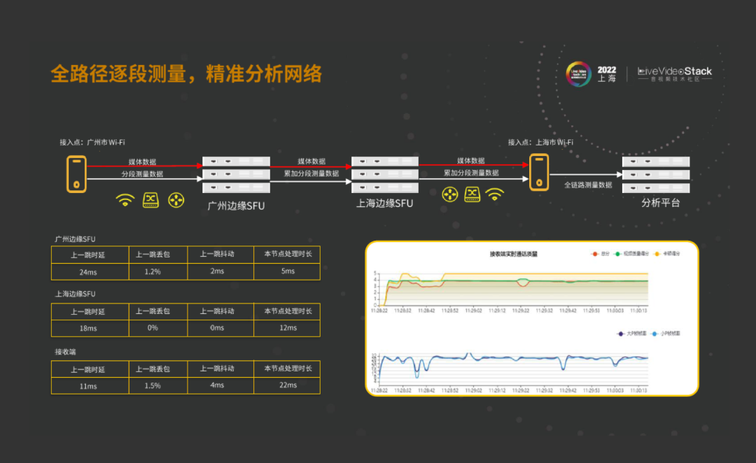 现在传统的探测手段都是每个接收端、SFU都把自己的数据分别报到大数据去,大数据再根据每个方式做关联。这样效率其实并不高,而且经常出现丢数据或者数据不准、对不齐等现象。