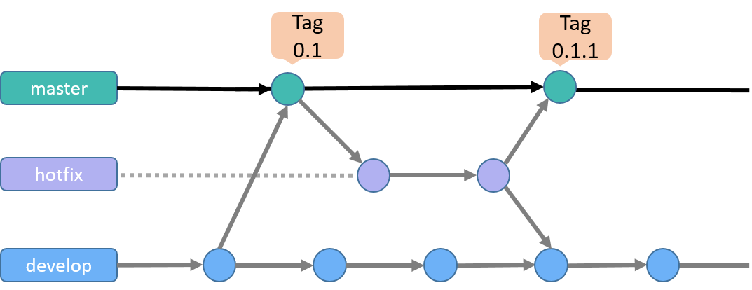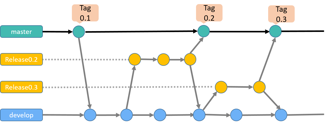 在发布正式版本之前,我们需要对即将发布的版本进行测试,bug修复,这时可以从develop分支上拉取一个release分支,在这个分支上进行测试和bug修复,预发布结束后必须将这个分支合并进develop和master分支。