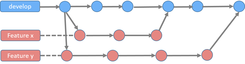 如果团队规模比较大,数十上百个开发人员都不断的向develop分支提交代码,难免会引入诸多问题,所以在需要开发一个新的功能特性时,会从develop上拉取一个feature分支,在这个分支上进行功能特性的开发,开发完成经过验证没有问题,再合入develop分支。