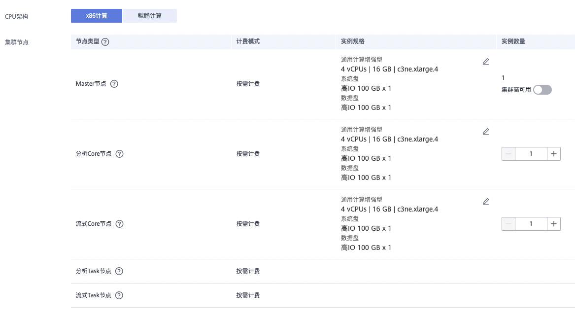 实例规格:点击编辑按钮,选择c3ne.xlarge.4|4 vCPUs | 16 GB,实例数量为1,系统盘和数据盘为高IO 100GB