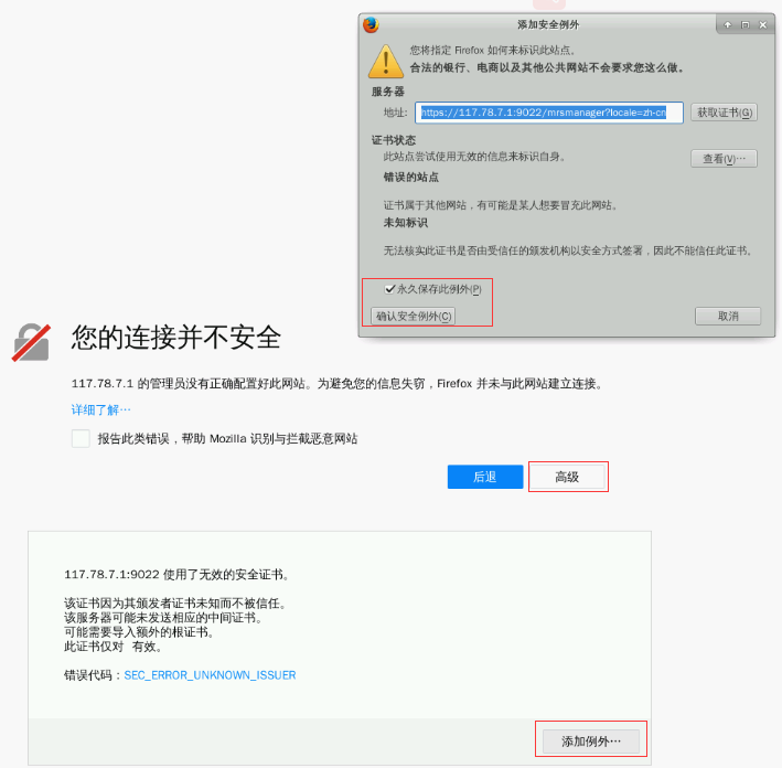 在弹出的浏览器页面(若未弹出请再次点击“点击查看”按钮,此时浏览器可能会阻止弹出该界面,请选择允许),选择“高级”-> "添加例外" ->“确认安全例外”,如下图所示