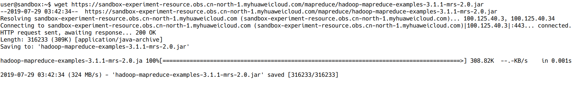 wget https://sandbox-experiment-resource.obs.cn-north-1.myhuaweicloud.com/mapreduce/hadoop-mapreduce-examples-3.1.1-mrs-2.0.jar