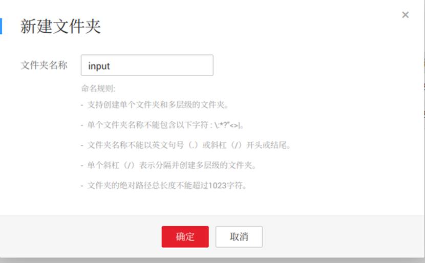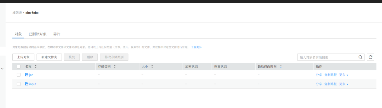 点击“立即创建”。创建完成后点击桶名称进入对象存储服务,点击左侧栏"对象",进入到对象管理页面,再点击“新建文件夹”创建一个名为“input”的文件夹,如下图