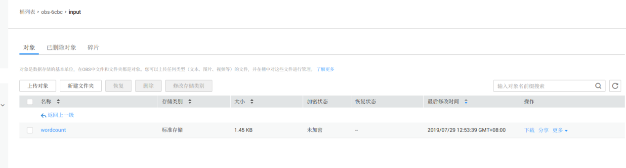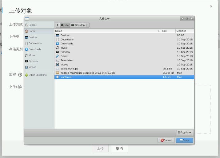 创建完成后,点击“input”文件夹名字进入到“input”文件夹,然后点击“上传对象”按钮弹出窗口(上传方式默认),点击“添加文件”将下载的“wordcount”(选择“Home”位置可看到下载的该文件)文件文档,点击“上传”到“input”文件夹