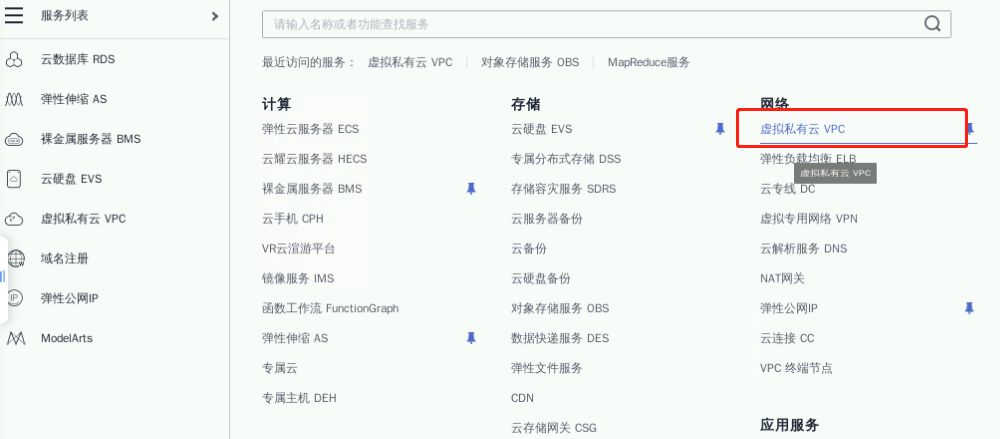 点击左上角服务列表,选择“虚拟私有云”服务