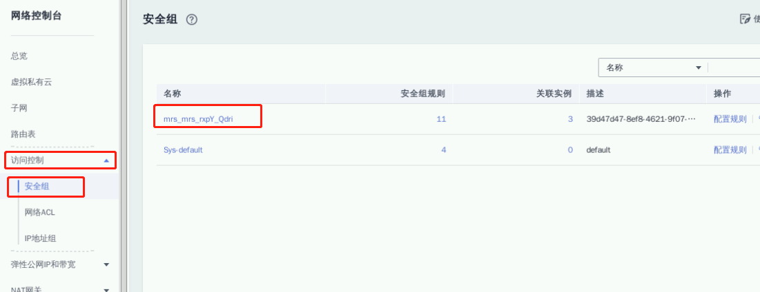 进入虚拟私有云管理界面后,依次单击左侧 “访问控制”->“安全组”,进入安全组管理界面后,点击以mrs开头的安全组
