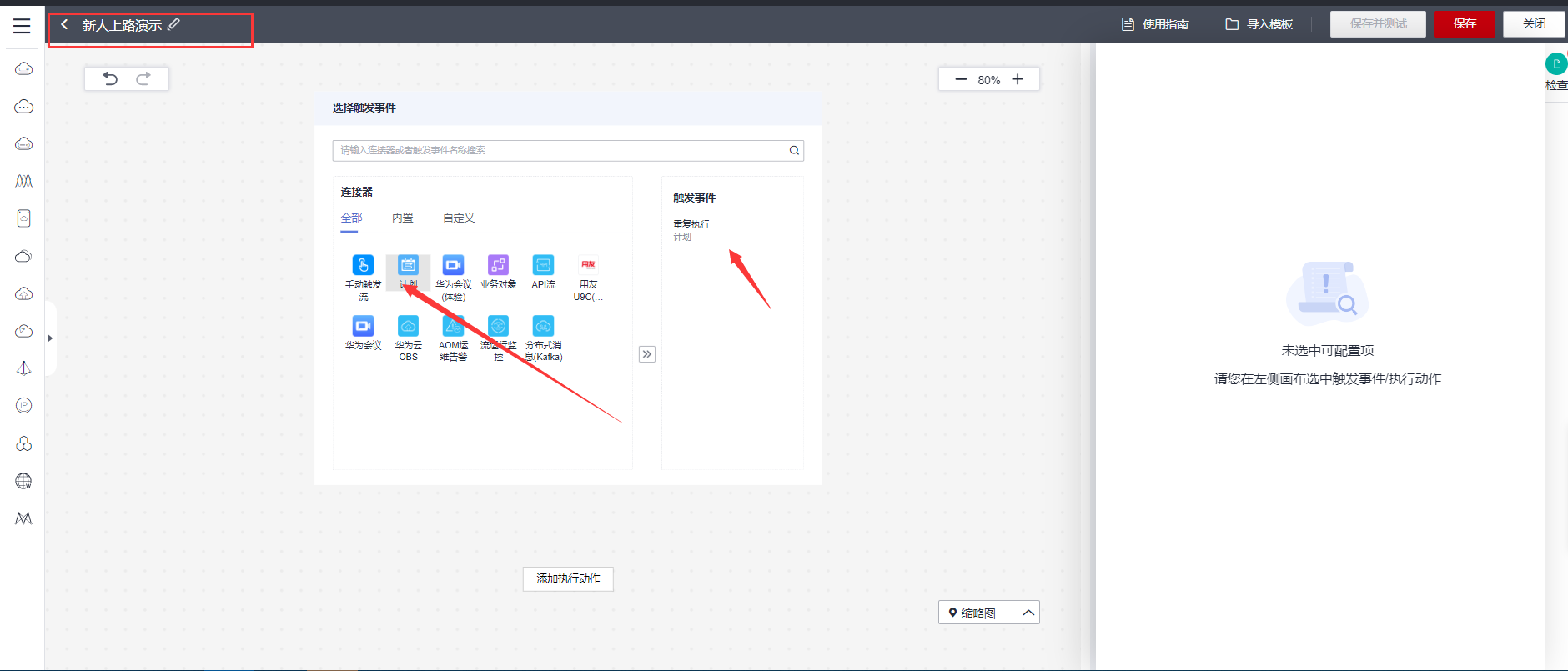点击创建流之后,会进入到编辑页面,选择触发事件,在该页面左上角可以修改流名称,这里修改为新人上路演示。