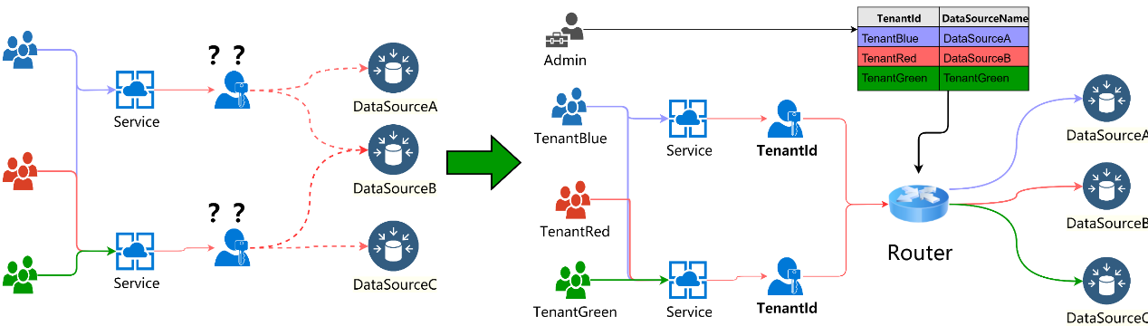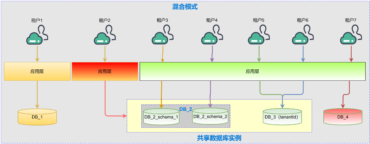 上图中租户1使用独立的应用层和数据层,不涉及资源共享,所以无需要考虑数据路由。图中的租户2-7,都涉及到了资源共享。其中租户3和租户4共享数据库实例,但是占用不同schema;租户5和租户6共享数据库实例,但不使用schema隔离,在业务表中使用租户标识隔离。共享应用层和数据库实例时,在处理业务逻辑过程中需要将租户的数据库相关操作指向正确的目标库,避免数据污染等一系列问题,此时即需要进行路由。