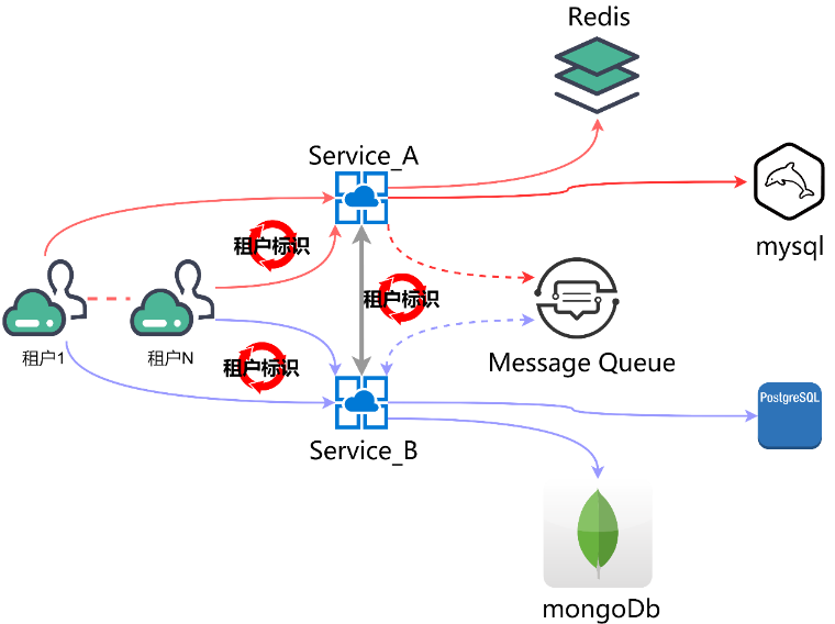 当租户进行数据操作时,可能涉及到关系型数据库的读写,nosql,缓存,消息队列,服务之间的调用等等场景,在这一条完整的链路中,数据的操作需要识别租户的身份,实际上是说租户的业务数据以及个性化配置是需要先识别租户身份的,否则会引起租户之间的数据污染,越权等等问题。