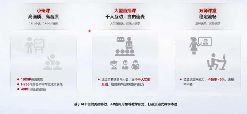 支持千人互动,自动上麦,帮助客户增加交互的能力。同时对于一些需要双师的场景,支持对应的双师课堂。极致的抗弱网能力,让两个老师的交互与学生保持流畅,在中小城市支持对应的优质网络接入。