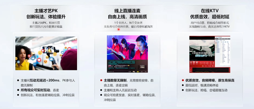 华为云RTC可以实现自由的,无时延的互动,同时支持抢麦发言、实时连麦、辅助拉票、冲刺拉票等功能。在在线k歌场景对于音乐爱好者,我们与大家一同追求更高的音质,更低的时延,帮助用户实现点歌、抢歌、合唱等各个场景满足大家在线娱乐的诉求。同时适用于网红直播、企业直播、娱乐直播、游戏直播等场景,提供功能强大的实时媒体处理能力,实现各种直播场景玩法,为客户和合作伙伴打造端到端一站式“音视频互动”解决方案。