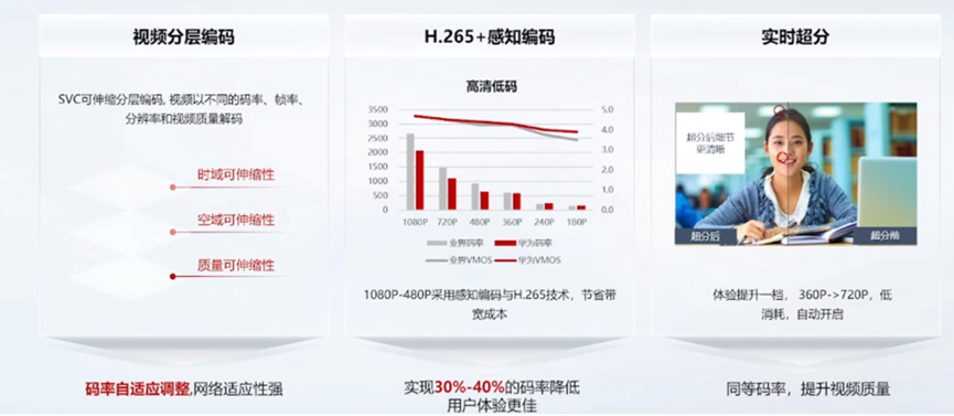 1080P视频分辨率、H265、感知编码技术,码率降低30%~40%。实时超分技术,体验提升一档,让细节更清晰。