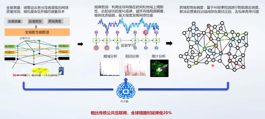 华为云利用AI预测和智能路由,突破了跨域通讯路由的挑战。支持全景测量,端管边云各分段各层级的网络质量探测、细粒度和低开销的测量技术。支持规律预测,利用全球网络在时间和地域上周期性、此起彼伏的变化规律,避开网络局部拥塞,提供优质链路,最大程度发挥网络性能。另外,支持跨域控制和调度,基于AI规律预测进行智能路由调度,解决运营商自治域间存在路径迂回、丢包率高等问题。相比传统公共互联网,全球链路时延降低20%。