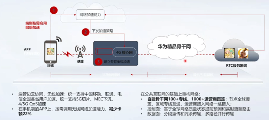 除了骨干节点建设在最后1km接入上,华为通过自建骨干网和网络协同的方式提供更精品的高速线路,在国内支持移动、联通和电信通过统一的5G切片和MEC下沉。能够实现同样的消息和app调用无线加速能力,减少22%以上的网络卡顿。