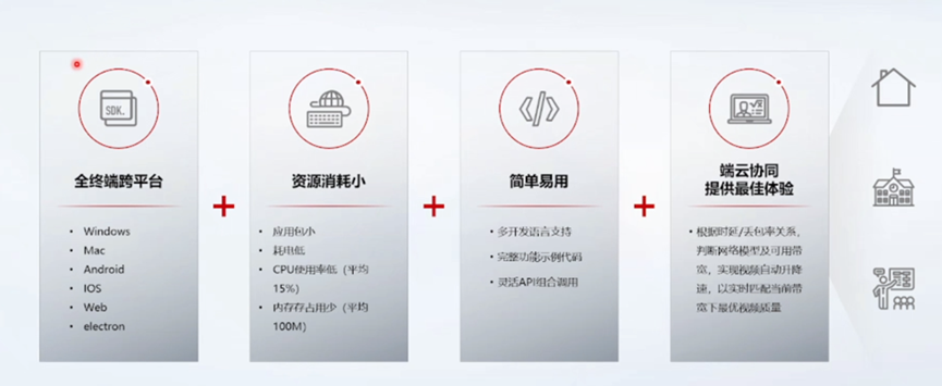 华为云音视频服务具备覆盖全终端的SDK,包括windows、Mac、Android、iOS、Web、electron,另外,资源消耗小,应用包小、耗电低、CPU使用率低(平均15%)、内存占用少(平均100M),简单易用,多开发语言支持、完整功能示例代码、灵活API组合调用。最后,通过端云协同提供最佳体验,根据时延、丢包率低关系,判断网络模型及可用带宽,实现视频自动升降速,以实时匹配当前带宽下最优的音视频质量。