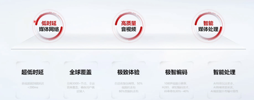 基于华为30年音视频编解码能力和优异弱网对抗能力80%丢包下音频通话流畅,50%丢包下视频通话流畅。支持大规模千人互动,万人观看,互动时延小于200ms。