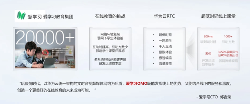 华为云SparkRTC应用于爱学习教育平台中,解决了在线教育中网络环境复杂、互动时延高、互动方少、运维成本高问题。使用华为云SparkRTC后线上课堂时延降低至200ms,互动方1000+、运维效率提升50%。