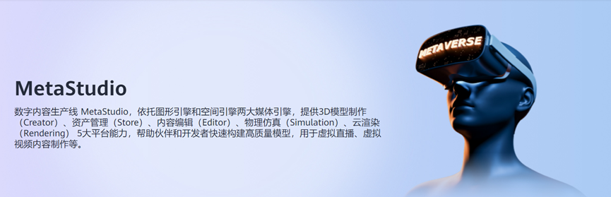 华为云MetaStudio(数字内容生产线),依托图形引擎和空间引擎两大媒体引擎,提供3D模型制作(Creator)、资产管理(Store)、内容编辑(Editor)、物理仿真(Simulation)、云渲染(Rendering) 5大平台能力,帮助伙伴和开发者快速构建高质量模型,用于虚拟直播、虚拟视频内容制作等。