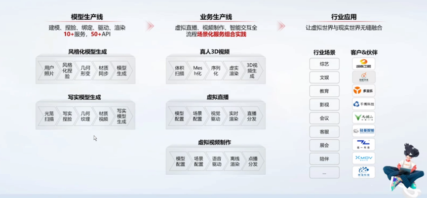 根据行业特征,提供标准化、模板化的场景方案能力,如卡通、美型、写实等多种类型数字人模型,离线内容制作、实时直播等多种内容生产,以及多场景智能交互。