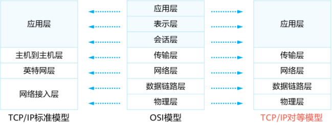 因为OSI协议栈比较复杂,且TCP和IP两大协议在业界被广泛使用,所以TCP/IP模型成为了互联网的主流参考模型,目前我们常用的是TCP/IP对等模型。三者的对应关系如下图所示: