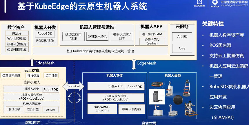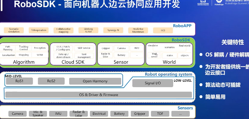针对KubeEdge的端边云统一管理,包括提供RobeSDK,可把应用分发到云,边或协同;开发出具体场景的SLAM与AI,还有就是机器人监控数据采集及训练;同时开发机器人的仿真平台加快机器人开发速度;