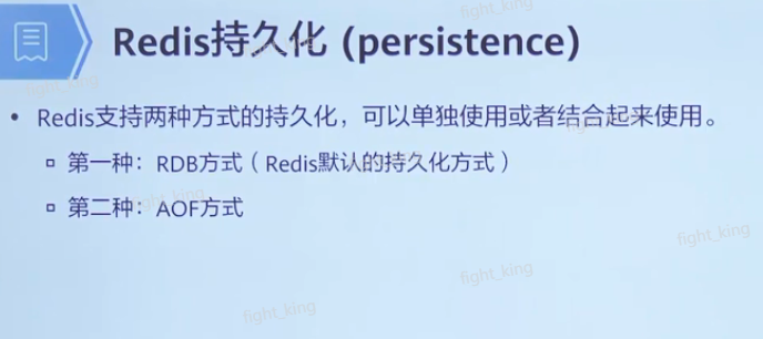 Redis持久化 (persistence)。Redis支持两种方式的持久化,可以单独使用或者结合起来使用。第一种:RDB方式(Redis默认的持久化方式),第二种:AOF方式。